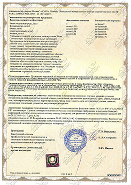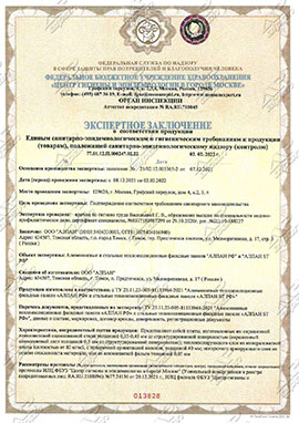 гигиеническим требованиям к продукции № 77.01.12.П.000247.02.22 от 02.02.2022 г.