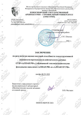 по результатам оценки несущей способности и конструктивной надежности применения в сейсмических районах СУФ "АЛПАН РФ", с облицовкой теплоизоляционными панелями "АЛПАН РФ" шифр 40.21.035. 2021 г.