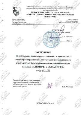 по результатам оценки теплотехнических и влажностных параметров ограждающих конструкций с использованием СУФ "АЛПАН РФ", с облицовкой теплоизоляционными панелями "АЛПАН РФ"