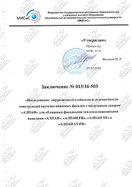 «Исследование коррозионной стойкости и долговечности конструкций системы навесных фасадов с воздушным зазором «АЛПАН» для облицовки фасадными теплоизоляционными панелями «АЛПАН» № 013/16-503 от 07.07.2016 г.